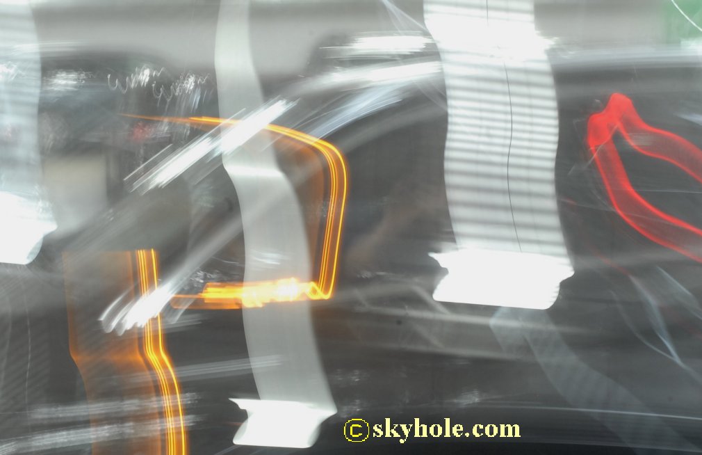 An abstract photo taken looking from inside a stationary car on a corner of a busy intersection