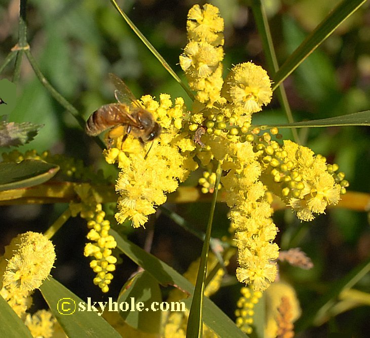 A winning photo of the year of a morning bee collecting pollen from an Australian Coastal Myall Wattle