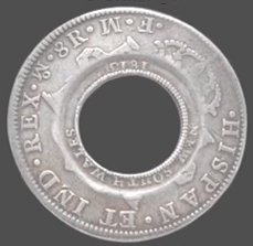 A Holey Dollar & the Dump were the first currency for Australia in 1812 made from the Mexican Reals & Spanish coins used till 1822 which were replaced with sterling coins from the UK. Prior to this the colony used Rum as a form of currency which contributed to it becoming a nation of alcoholics and the self inflicted illnesses that the addiction causes. The Holey Dollar in good condition is worth about $150.000. The coin shows the M with a small "o" above the M which means the Reals coin was stamped in Mexico! Initially 10,000 coins were order by Governor Macquarie which he had a convict forger to organize the design and stamping of the new Australian Holly Dollar and Dump currency!